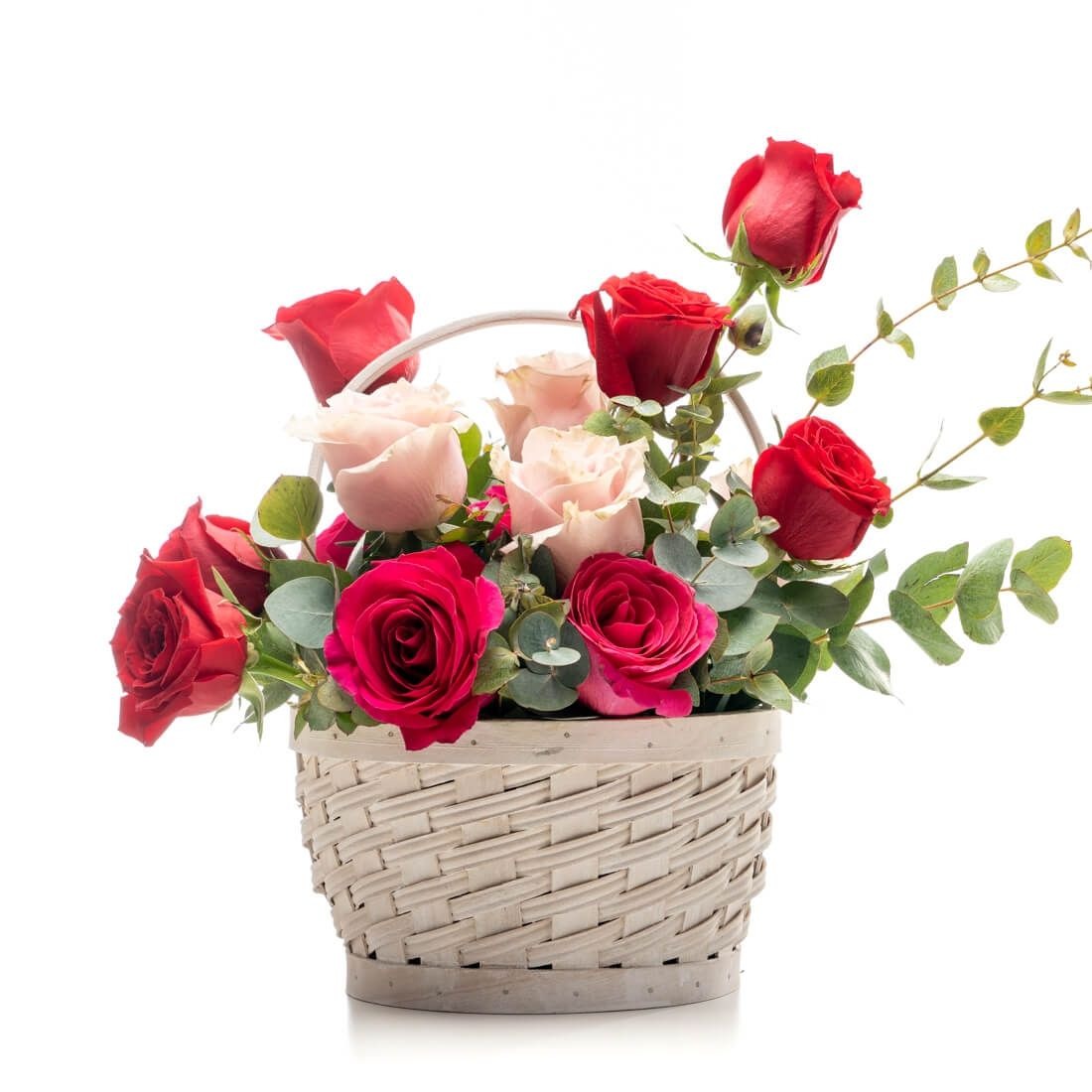 Când eleganța clasică se împletește cu emoția, rezultă un aranjament floral cu adevărat special! Trandafirii roșii premium simbolizează iubirea profundă, trandafirii cyclam adaugă o notă de mister, iar trandafirii roz completează perfect acest mix cu delicatețea lor. Toate aceste flori minunate sunt așezate cu grijă într-un coș elegant, iar eucaliptul proaspăt le învăluie într-o aură de naturalețe.