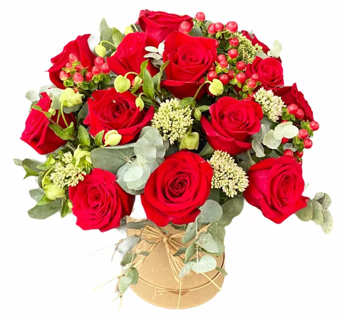 Când cuvintele nu sunt de ajuns, lasă florile să vorbească pentru tine! Trandafirii roșii premium, simbol al iubirii pasionale, se împletesc armonios cu hypericum-ul delicat și helleborus-ul elegant, într-un dans al rafinamentului. Prospețimea eucaliptului adaugă un plus de naturalețe și echilibru acestui aranjament impresionant.