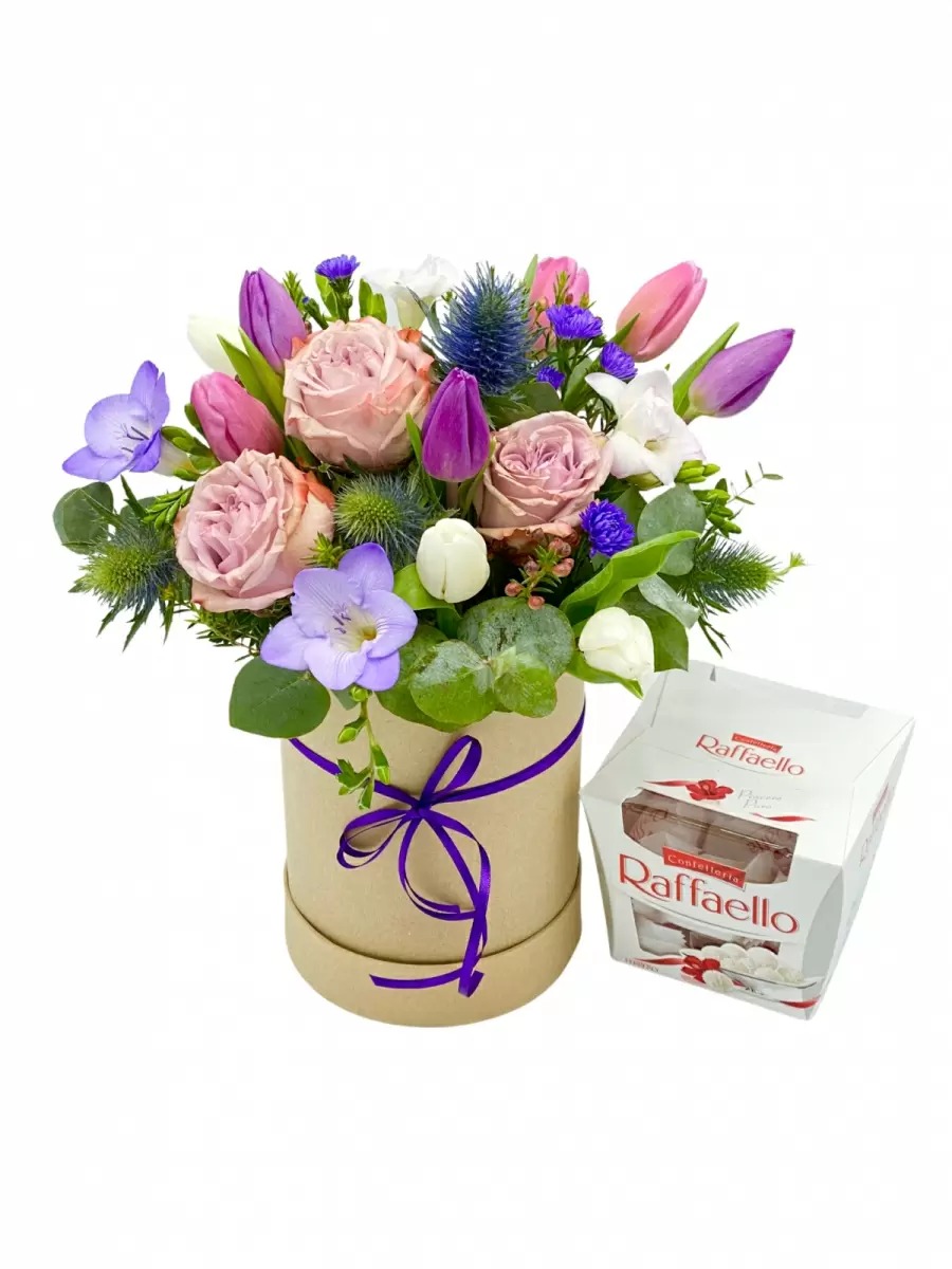 Un mix floral elegant, creat pentru a aduce un strop de magie oricărei zile! Trandafirii lila, lalelele delicate în tonuri de roz, mov și alb, alături de freziile parfumate și eryngium-ul sofisticat, formează un aranjament fermecător, pus în valoare de frunzele de eucalipt. Toate acestea sunt așezate cu grijă într-o cutie din catifea fină, alături de o cutie de bomboane Raffaello – un plus de răsfăț pentru cei dragi!