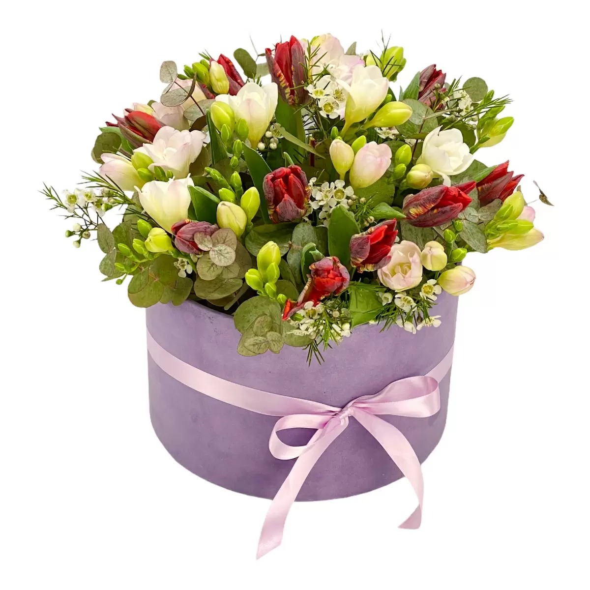 Un aranjament floral care îmbină armonios culorile și parfumurile primăverii. Lalelele roșii intense aduc un strop de pasiune, freziile albe emană delicatețe și puritate, iar accentele fine de waxflower și eucalipt completează perfect această compoziție elegantă. Așezat cu grijă într-o cutie de catifea L, Lavander Box este cadoul ideal pentru momente speciale.