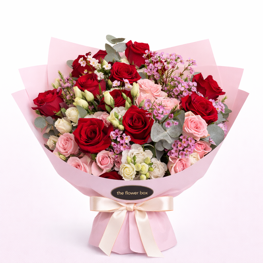 Un aranjament intens și elegant, în care cei 11 trandafiri roșii și cele 3 miniroze roșii exprimă pasiune și profunzime. Lisianthusul alb aduce echilibru și rafinament, iar accentele delicate de waxflower roz adaugă un aer romantic și diafan. Eucaliptul completează compoziția cu prospețime și textură naturală.