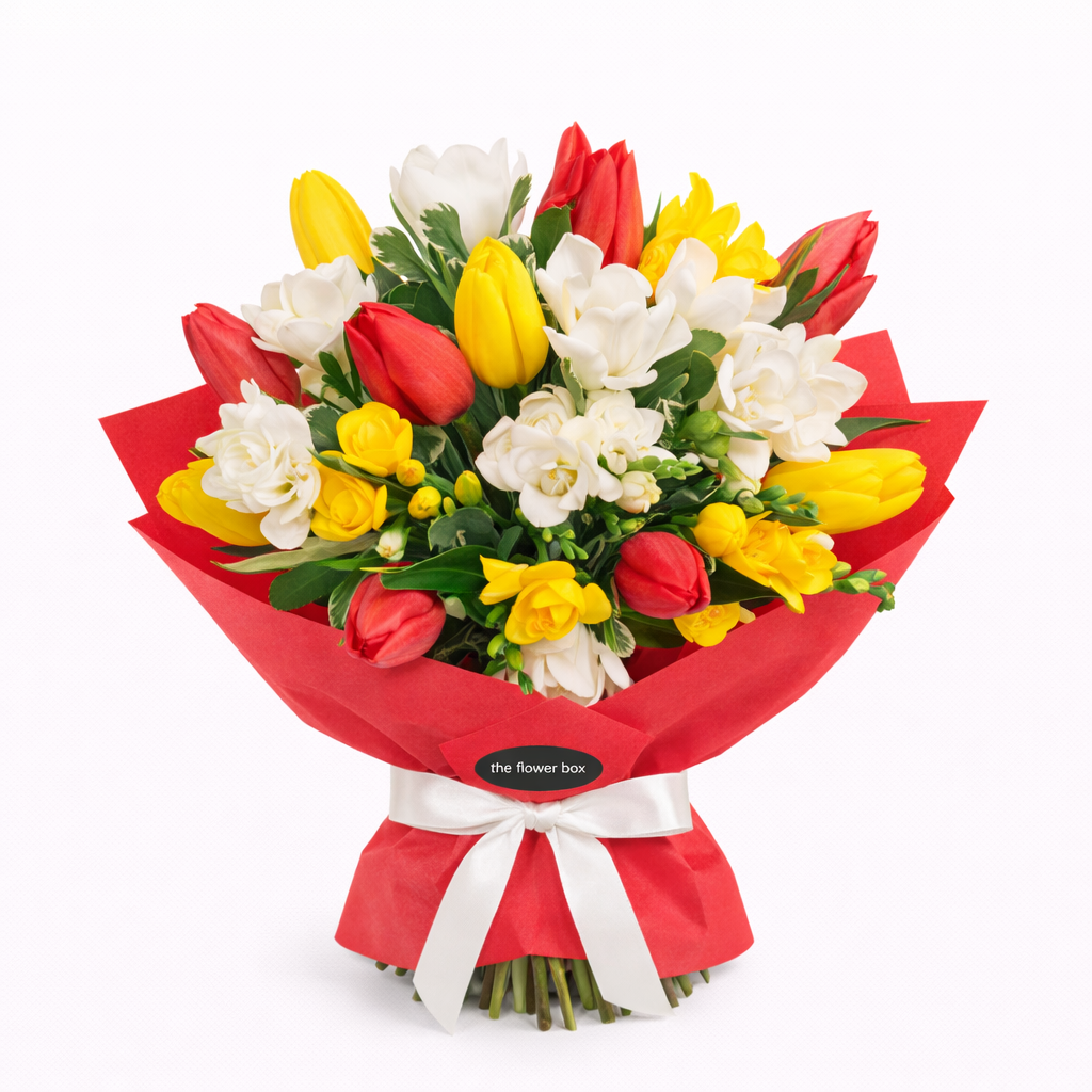 Contrastul dintre roșul intens, galbenul solar și albul luminos creează un aranjament expresiv și echilibrat. Freziile parfumate adaugă finețe și lejeritate, iar accentele de eucalipt oferă un aer fresh și natural.