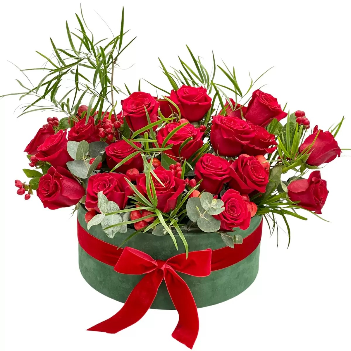 - Contine: 25 trandafiri rosii premium, 8 hypericum rosu, ruscus, eucalipt, cutie catifea XL, punga cadou si alte materiale