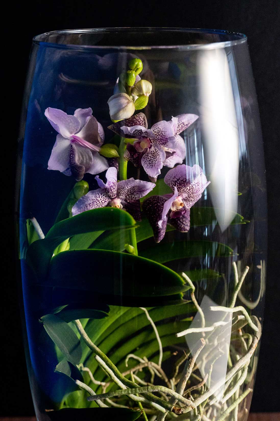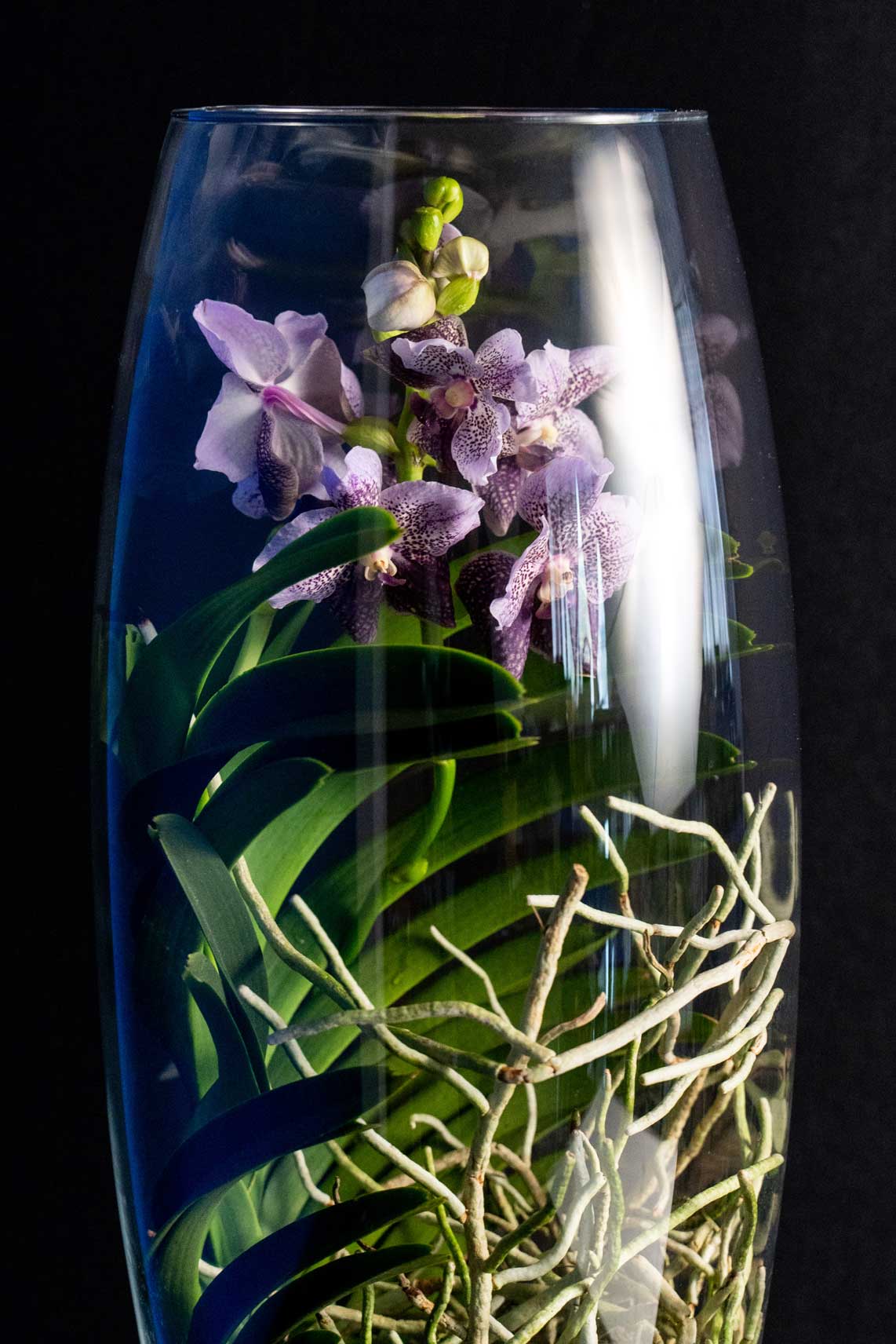 DESCRIERE: 1 x Orhidee Spectaculoasa VANDA, 1 x Vas sticla PREMIUM (Diametru ghiveci: 24 cm, Inaltime: 80 cm)