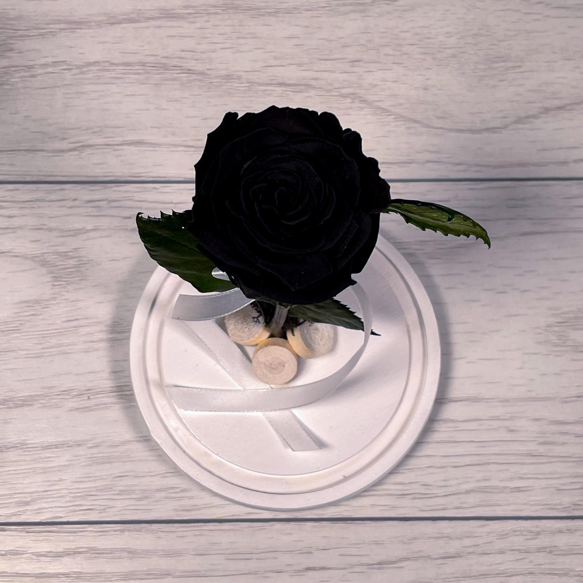 DESCRIERE: 1 x Trandafir Criogenat, 1 x Accesorii, 1 x Cupola sticla cu suport din lemn (Diametru suport: 12 cm, Inaltime: 25 cm)